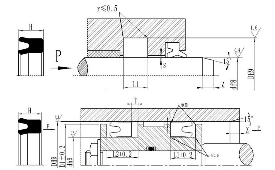 UHS U シールは、ボアとシャフトの両方の用途に適した対称シールです。断面が小さく、一体型の溝に取り付けることができます。 16~32MPaの圧力で使用する場合は根元に止め輪が必要です。